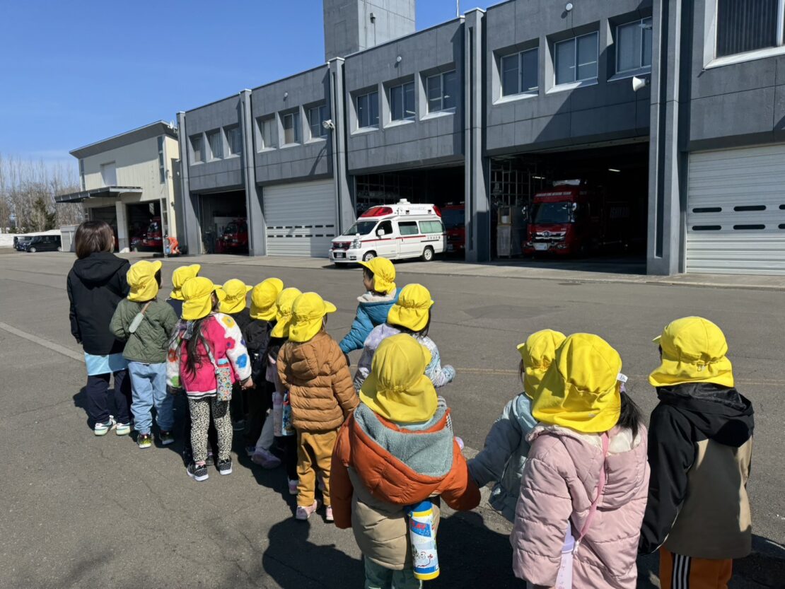 ひまわり(年中)組昨日は、天気も良かったので、消防署まで散歩に出かけました。どんな車がいるか楽しみに、30分ほどかけて到着。消防車、救急車、ハシゴ車など子どもたちが見たいと楽しみにしていた車を見ることができました。