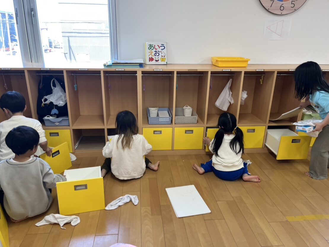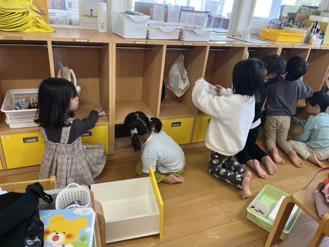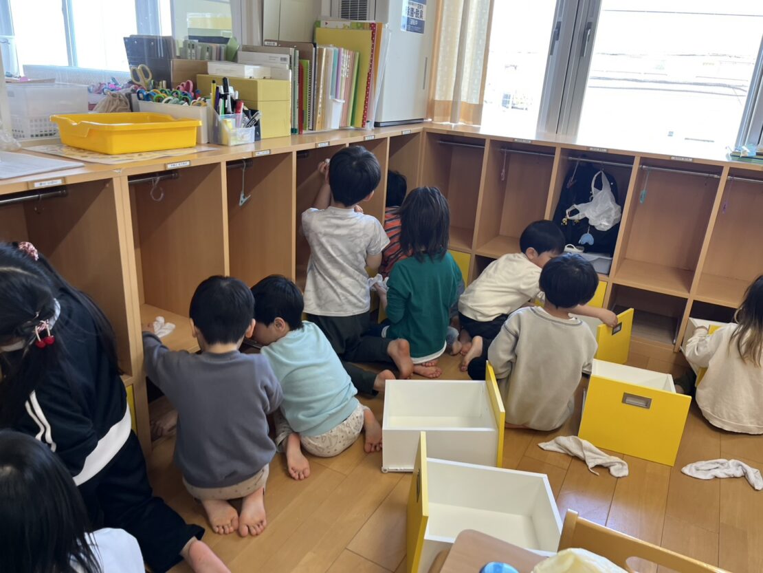 今日は、お部屋の大掃除をしました。ロッカーの中、床など、。そろそろ終わりにしようと声をかけても、「まだまだ〜!」と掃除を続け、やる気マンマンの子どもたち。