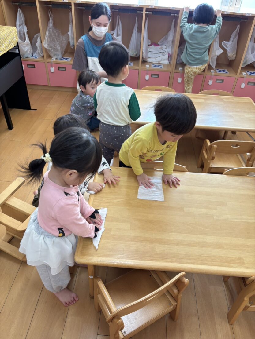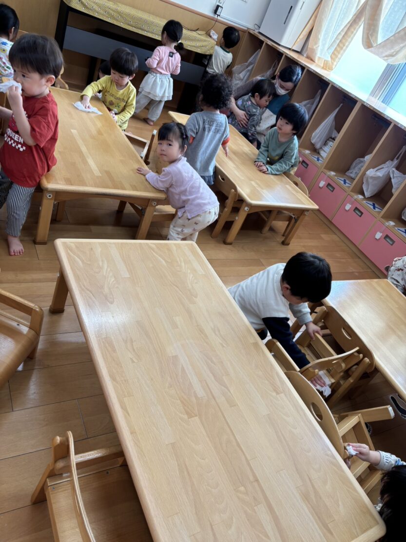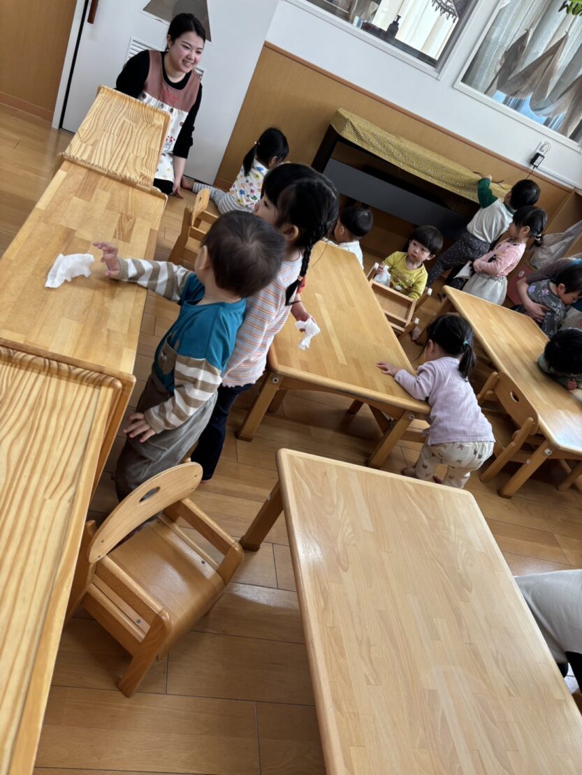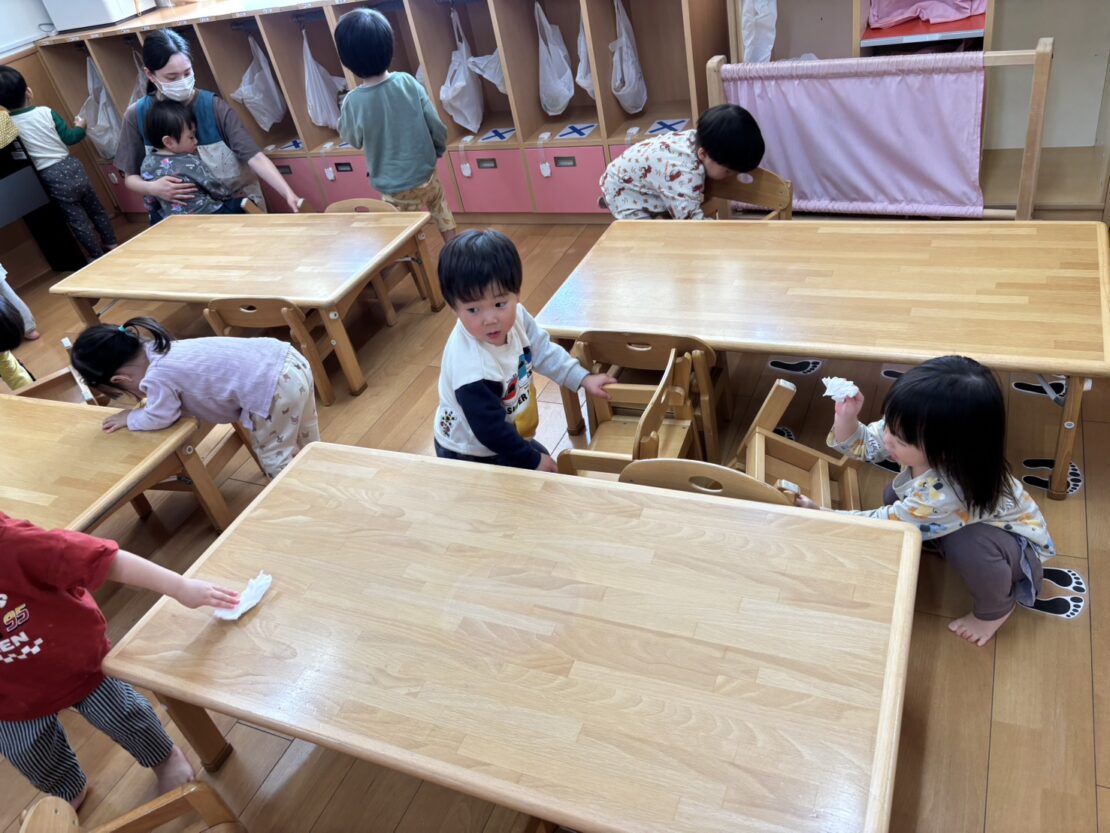 「お別れするお部屋をみんなでピカピカにしよう!」の声掛けだけで、自主的に動き出し、椅子やテーブルを拭きだしたので、先生方もびっくり!