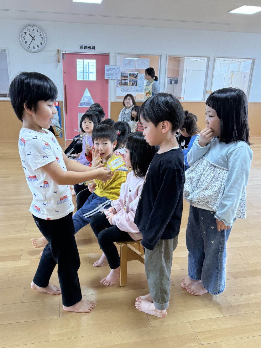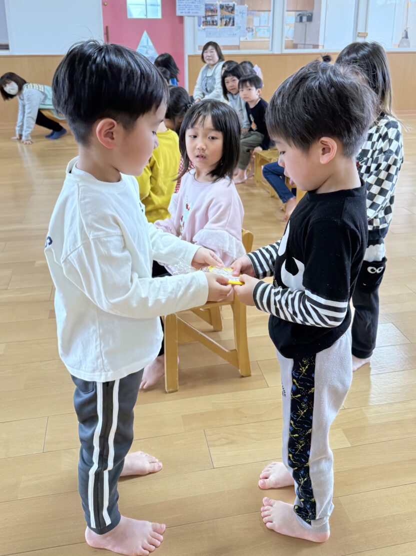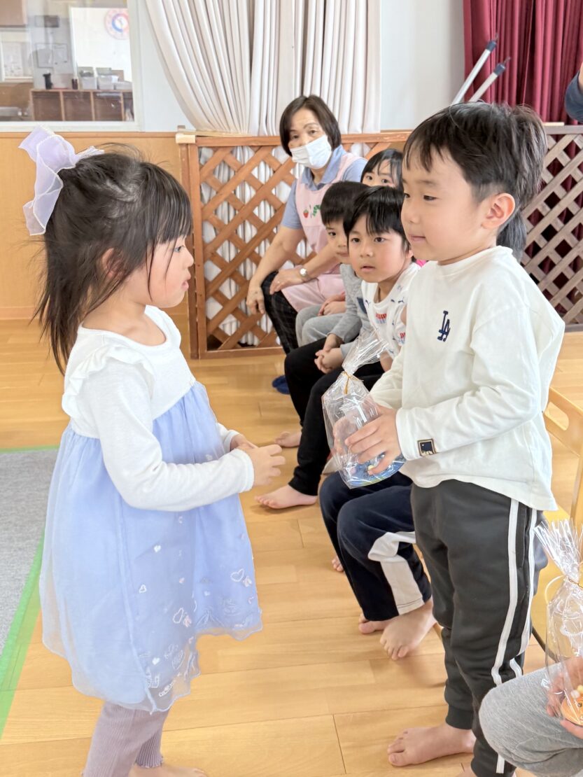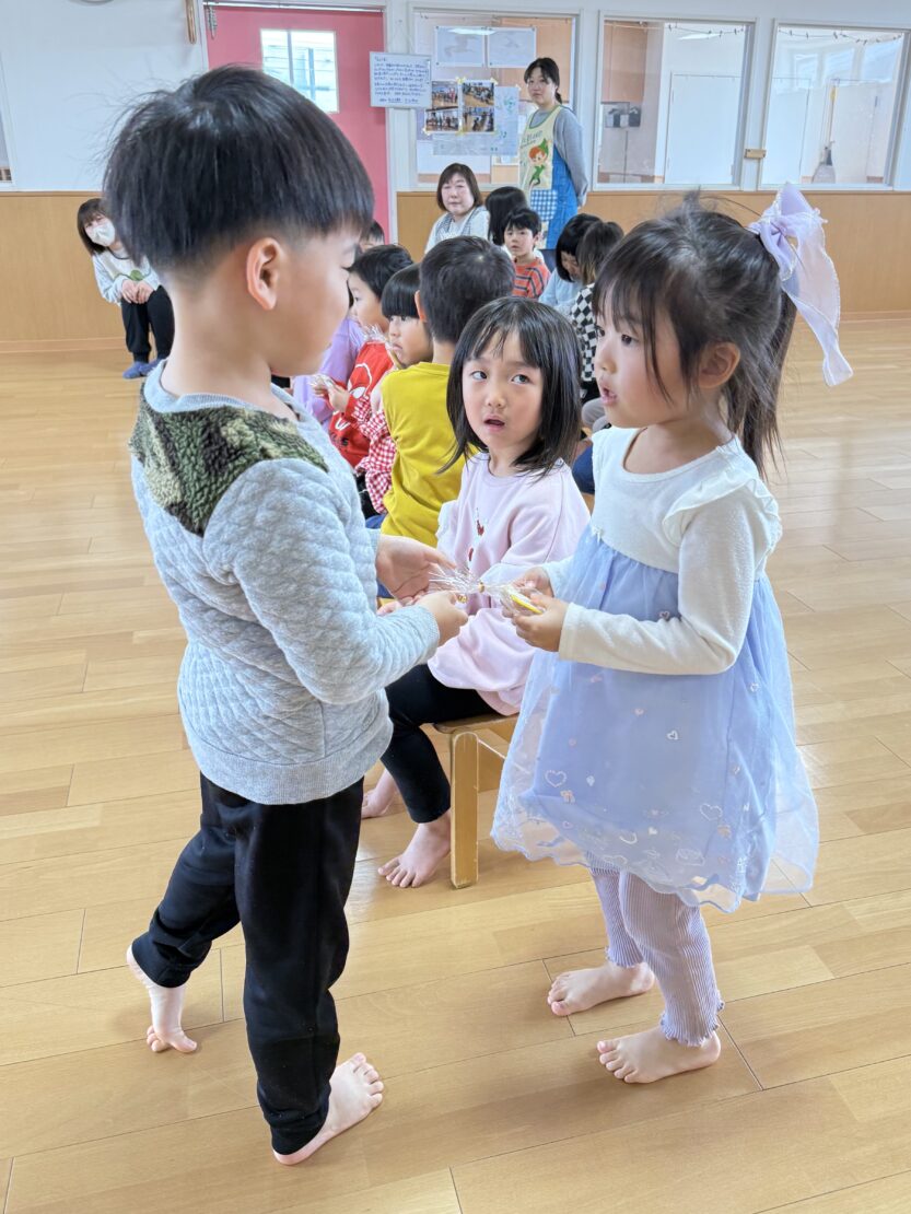 最終登園日を明日に控えて今日はひまわり(年中)組さん、ちゅうりっぷ組(年少)さんとのお別れ会でした。