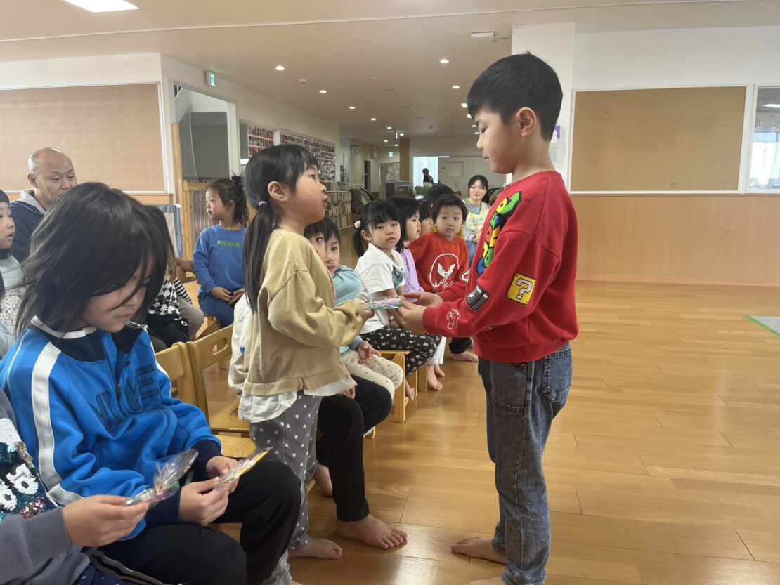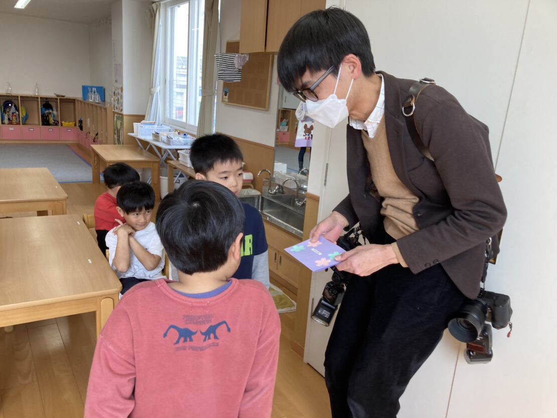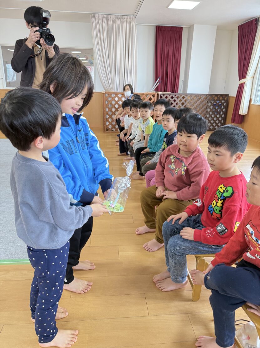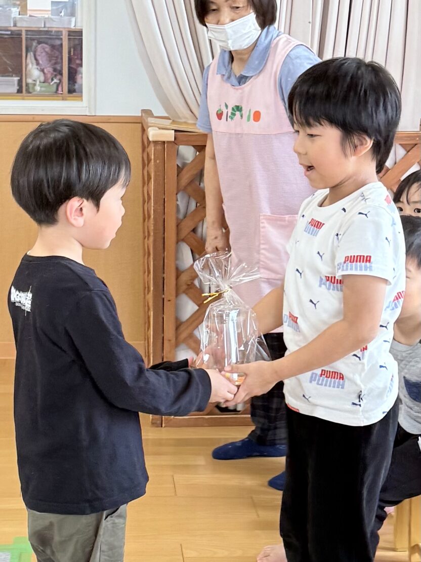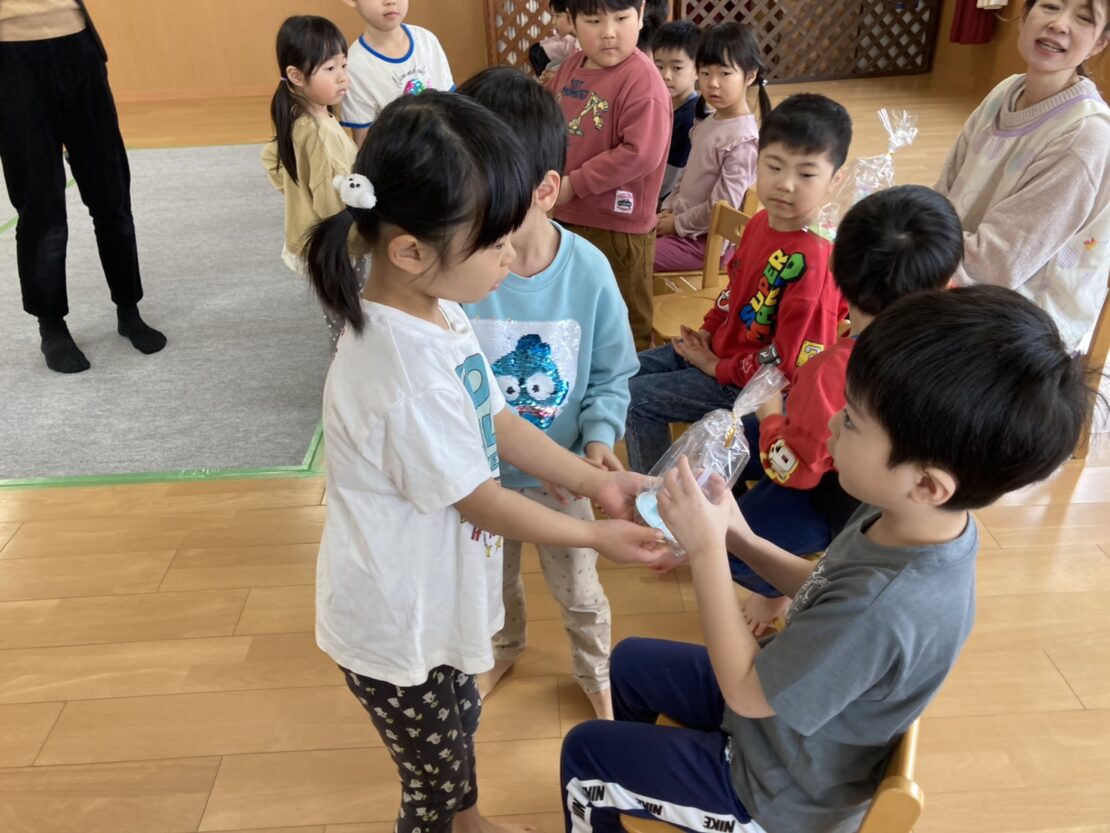 ちゅうりっぷ(年少)組にさくらさんがサプライズでプレゼントを渡しにきてくれました!