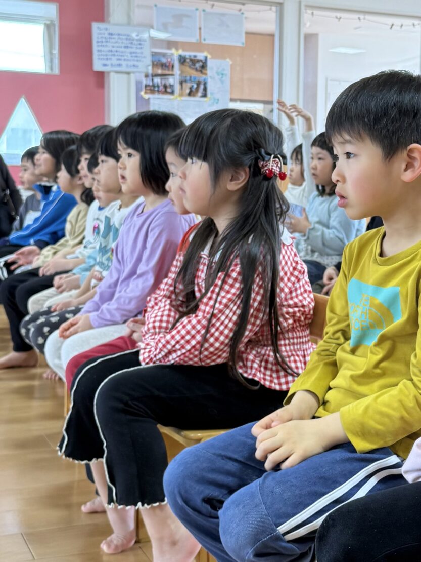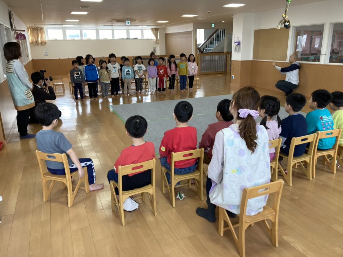ひまわり組さんから「あおいそらにえをかこう」を、ありがとうの気持ちを込めてさくら組さんに、その後さくら組さんの手話の歌「たんぽぽ」が披露されました。