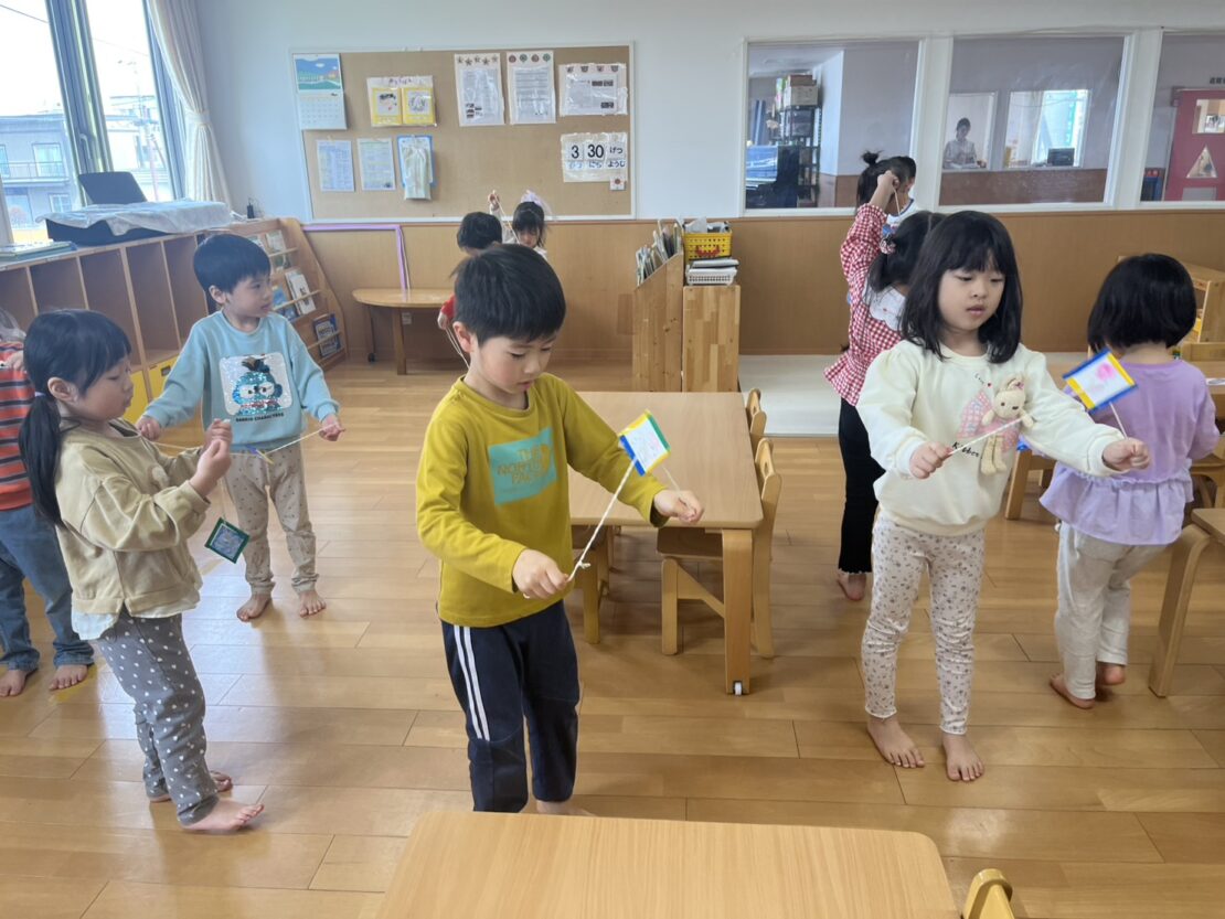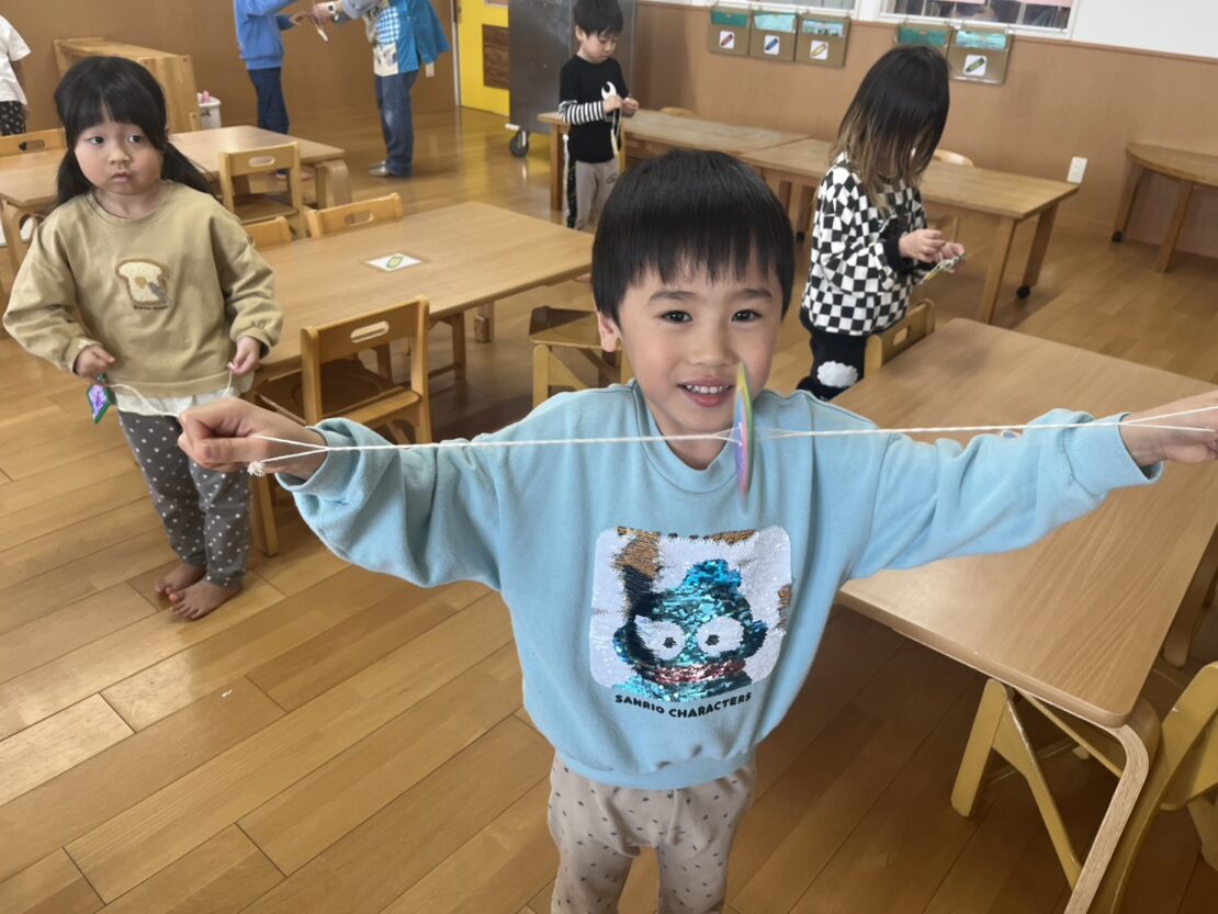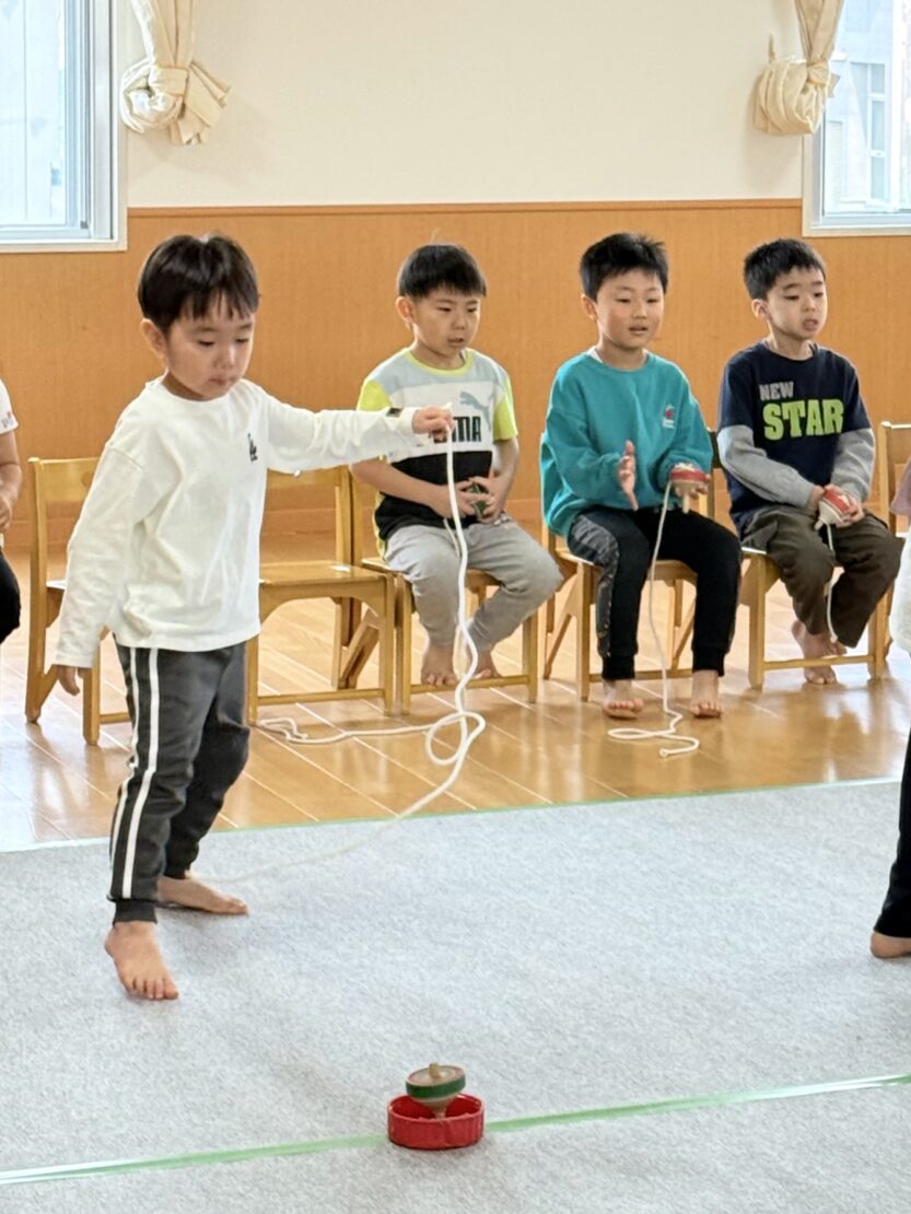 早速部屋に戻ってびゅんびゅんごまの練習。コツを掴んですぐに回せる子、なかなか上手く回せず必死に練習する子、様々な表情を見せてくれました。