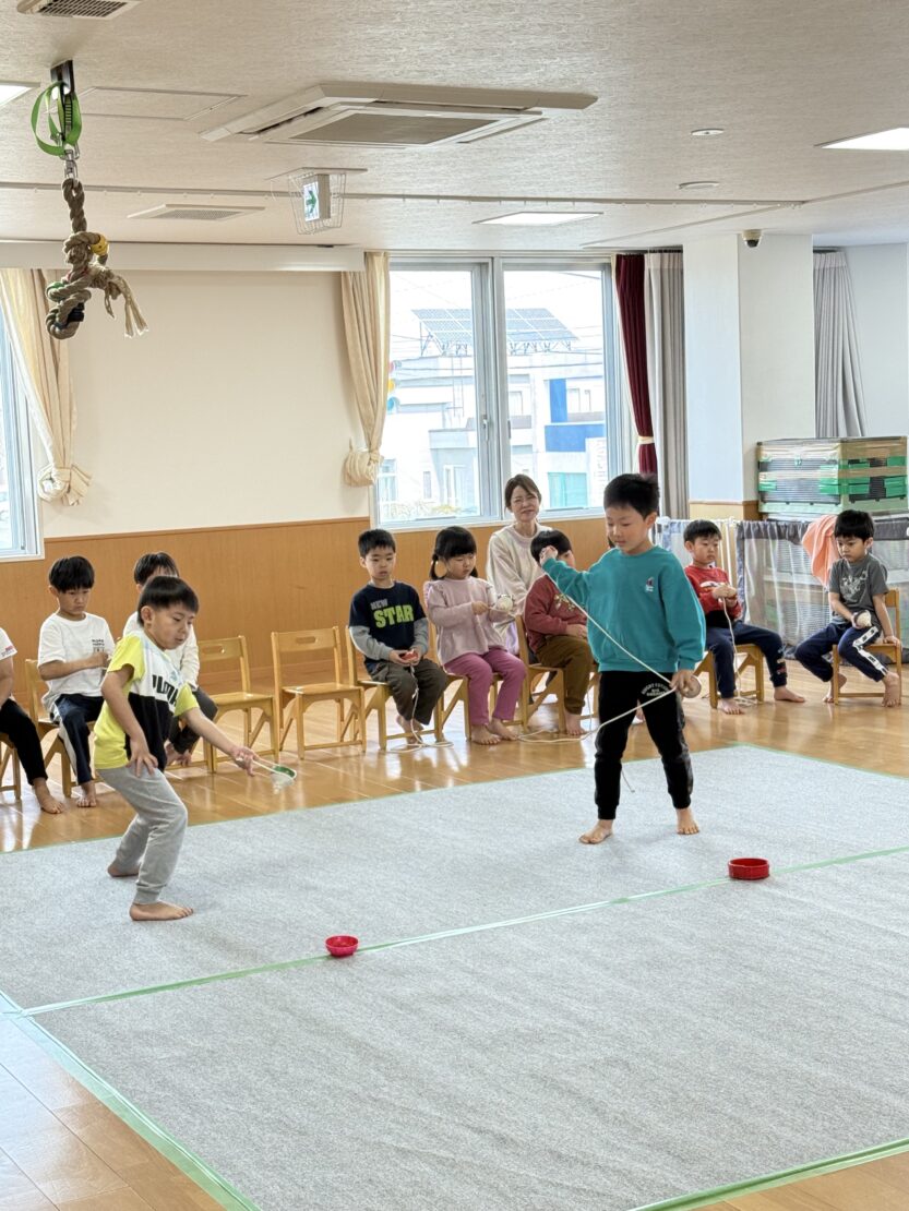 コマ演技披露では、発表会後の1か月でさらに磨きのかかった集中力で、狙った器にどんどん投げ入れていきます。