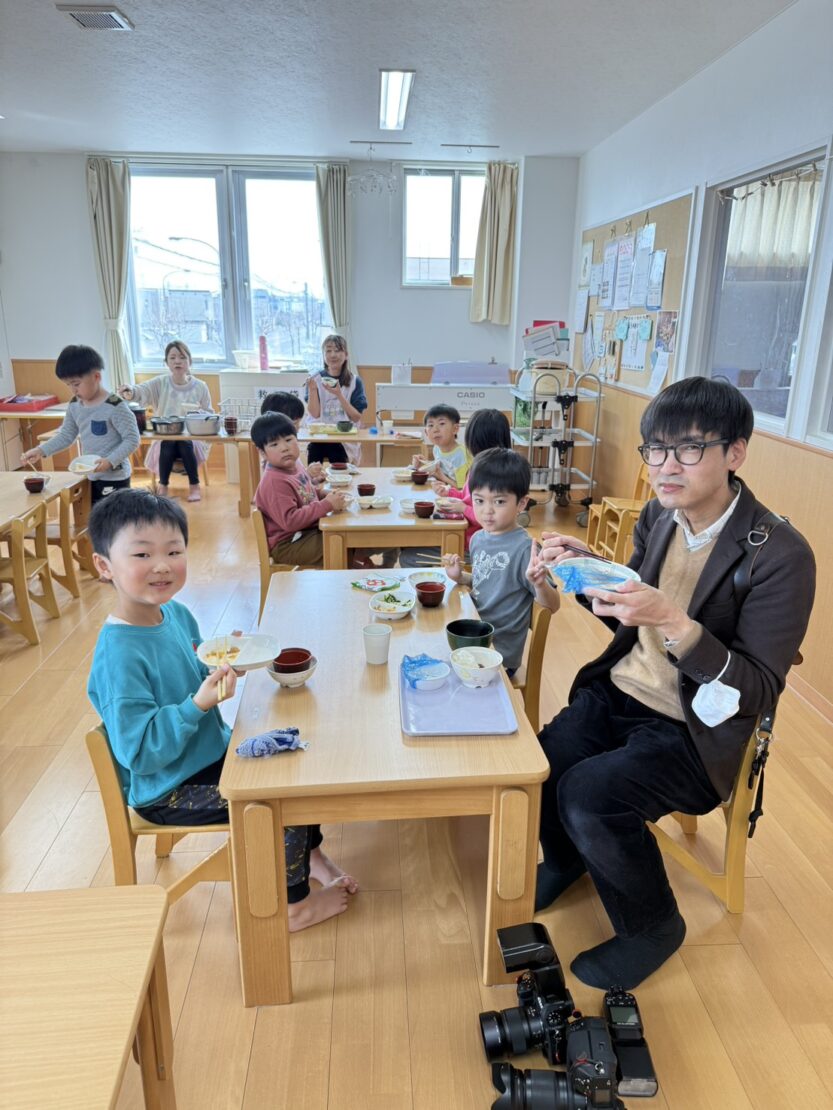 今日の給食は、一年間お世話になったカメラマンの細野さんと一緒に食べました。