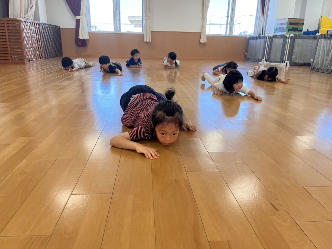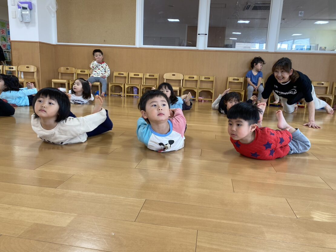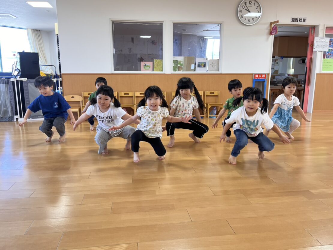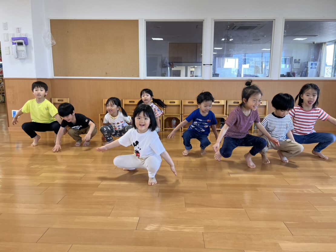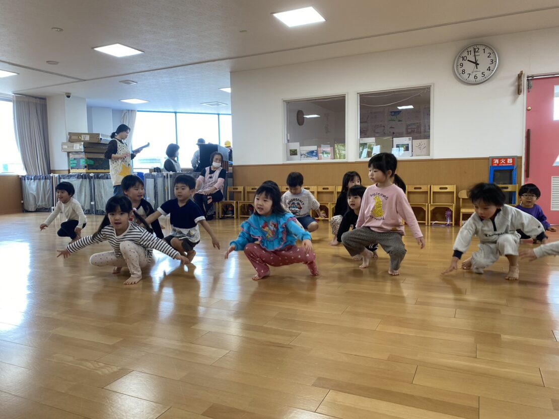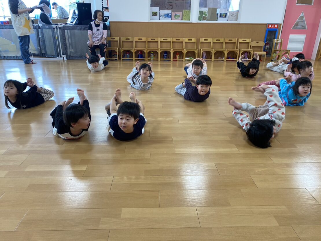 朝から園庭でたっぷり遊んだ後も、元気いっぱいにリズム遊び。