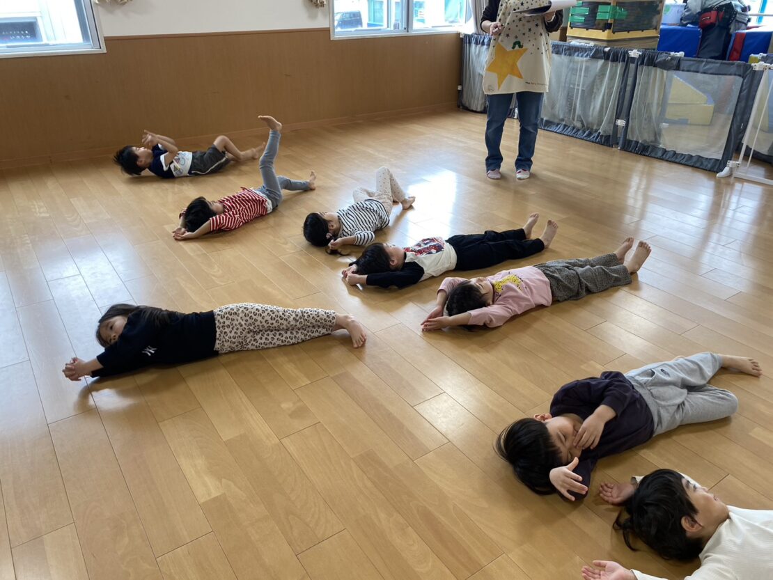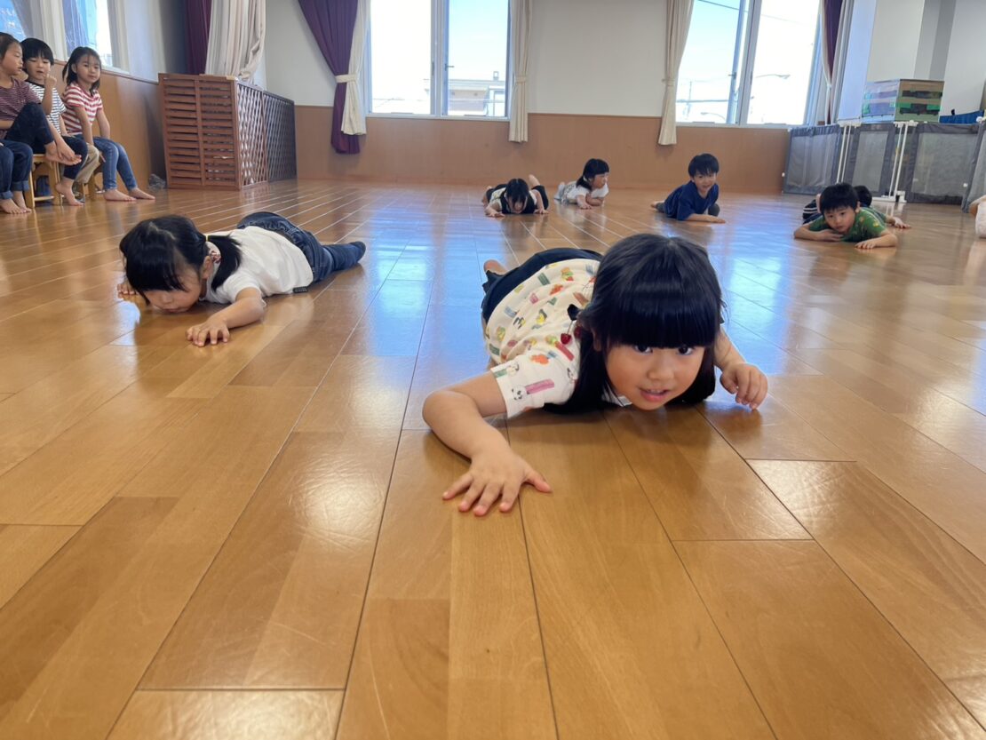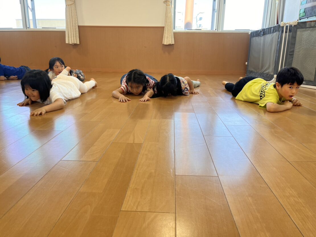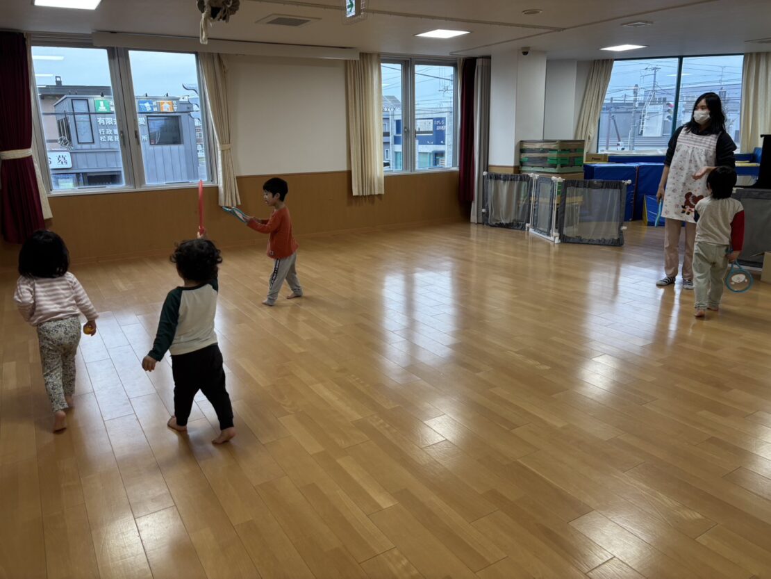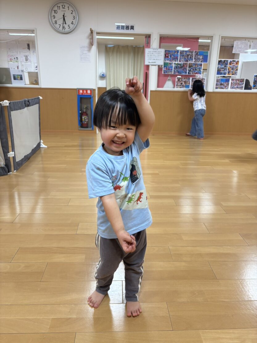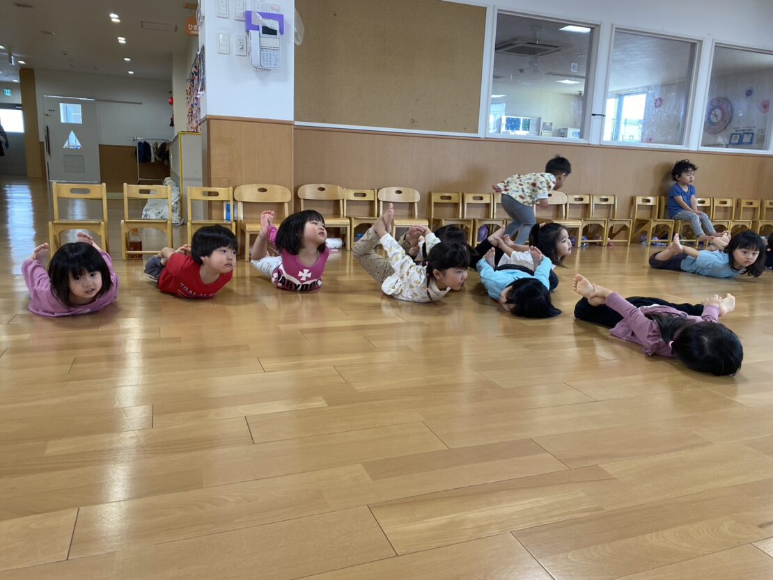 朝から園庭でたっぷり遊んだ後も、元気いっぱいにリズム遊び。