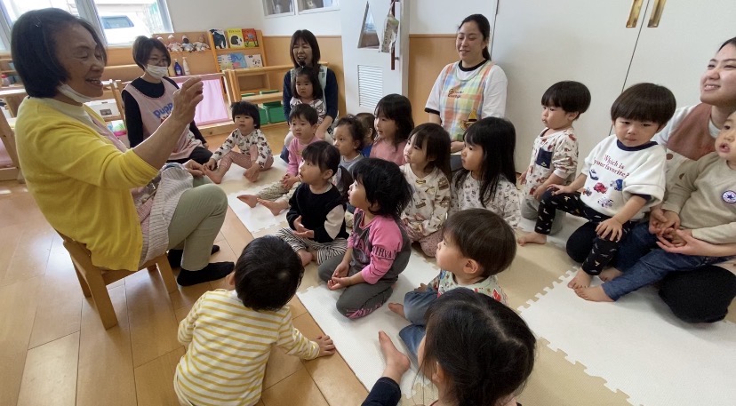 ふう先生のわらべうたが大好きなすみれ(2歳児)組のみんなは、ふう先生が来る前から上手に座って待っていましたよ。