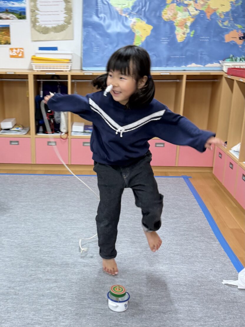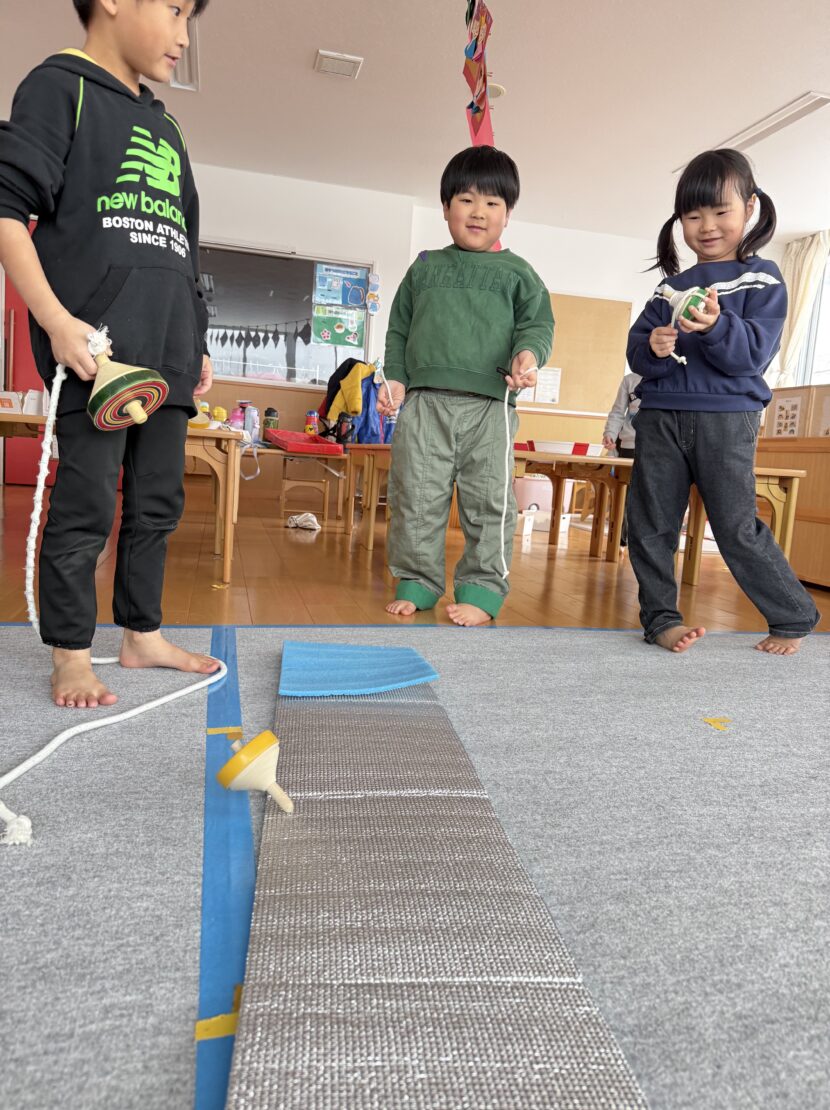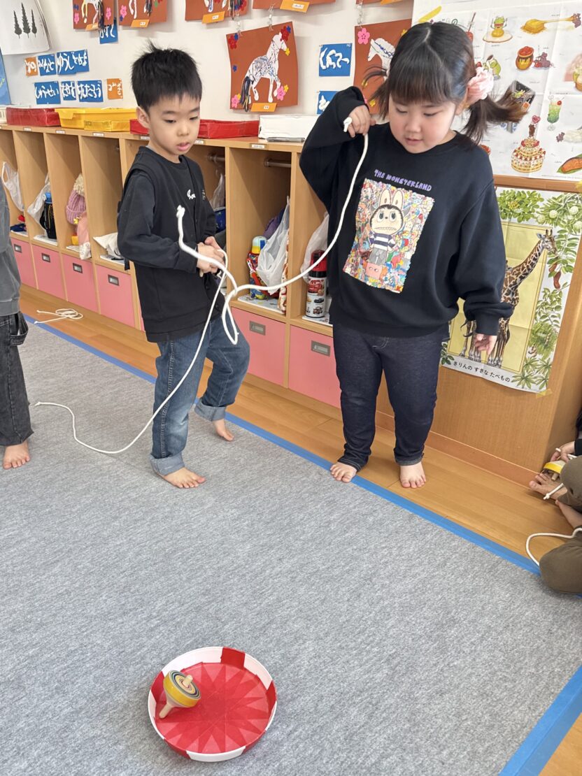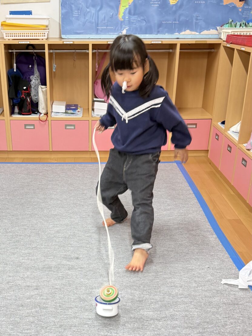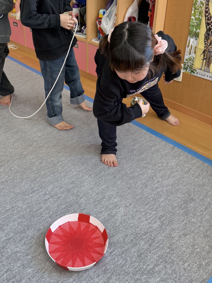 さくら(年長)組ではコマの投げ入れが佳境に入っています。