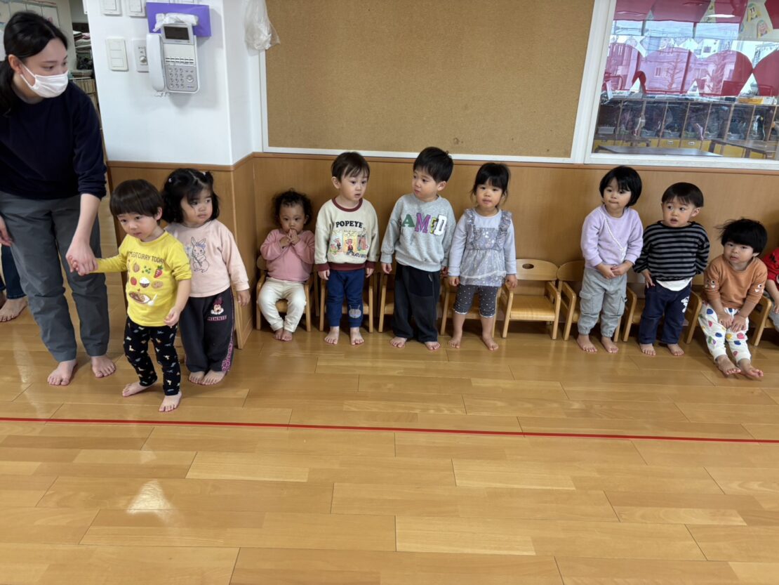 2月27日ひまわり(年中)組ともも(1歳児)組合同でリズム遊びをしました!
