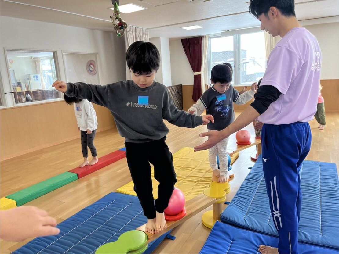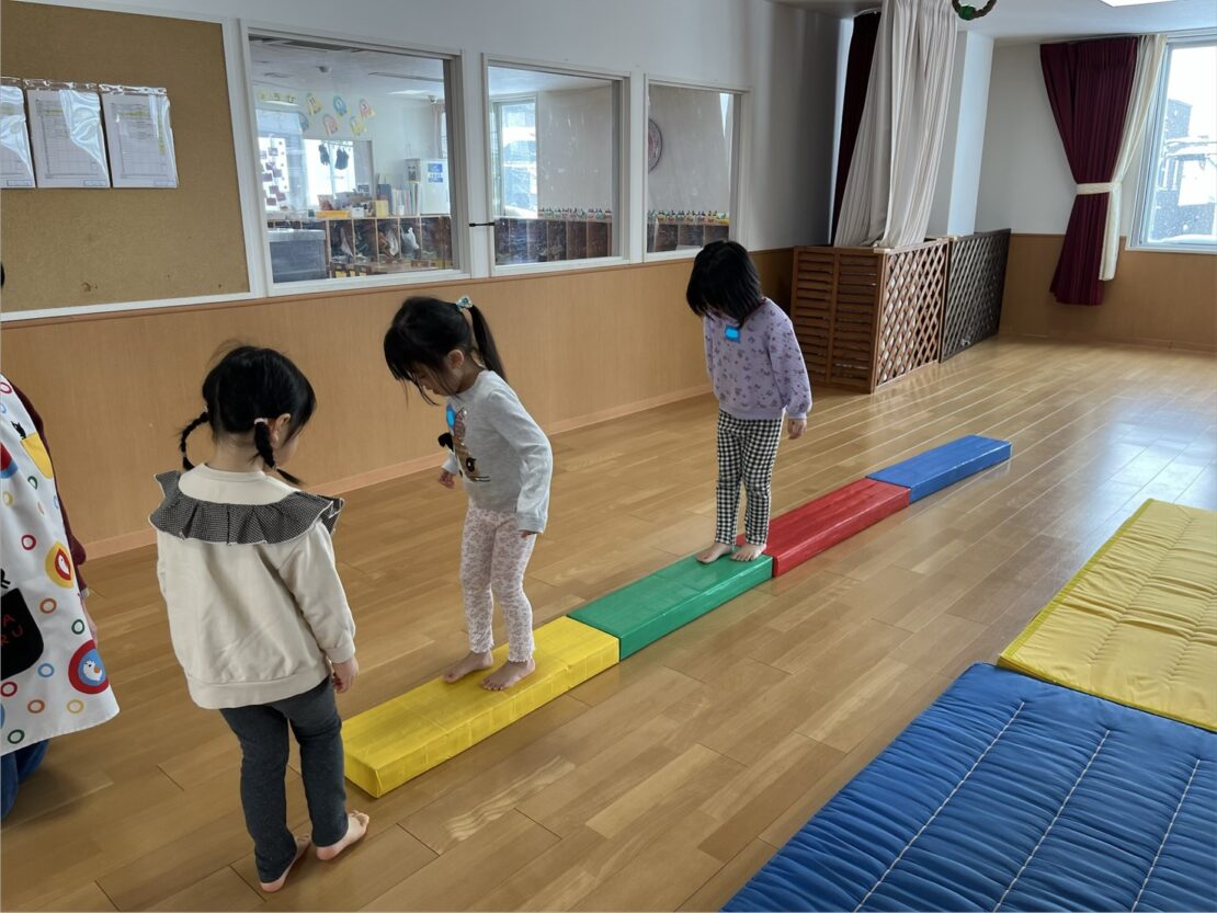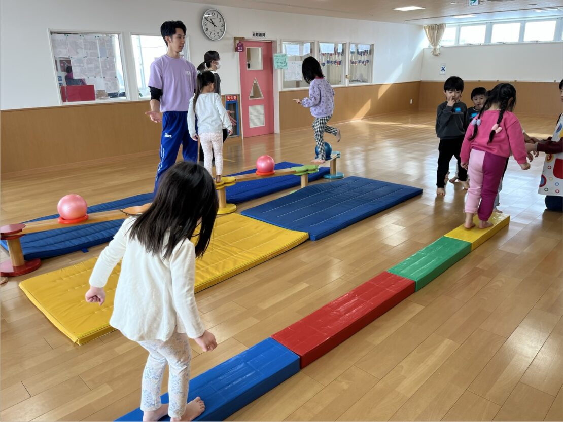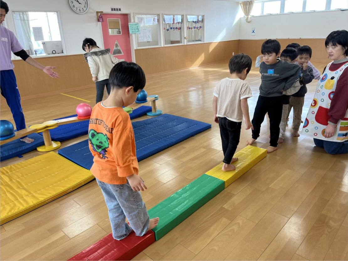 その後は、前回に引き続き平均台を行いました。横向きや後ろ向きで落ちないように慎重に歩いて渡りましたよ。