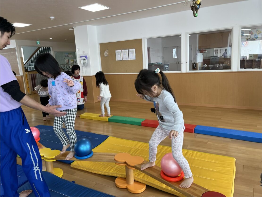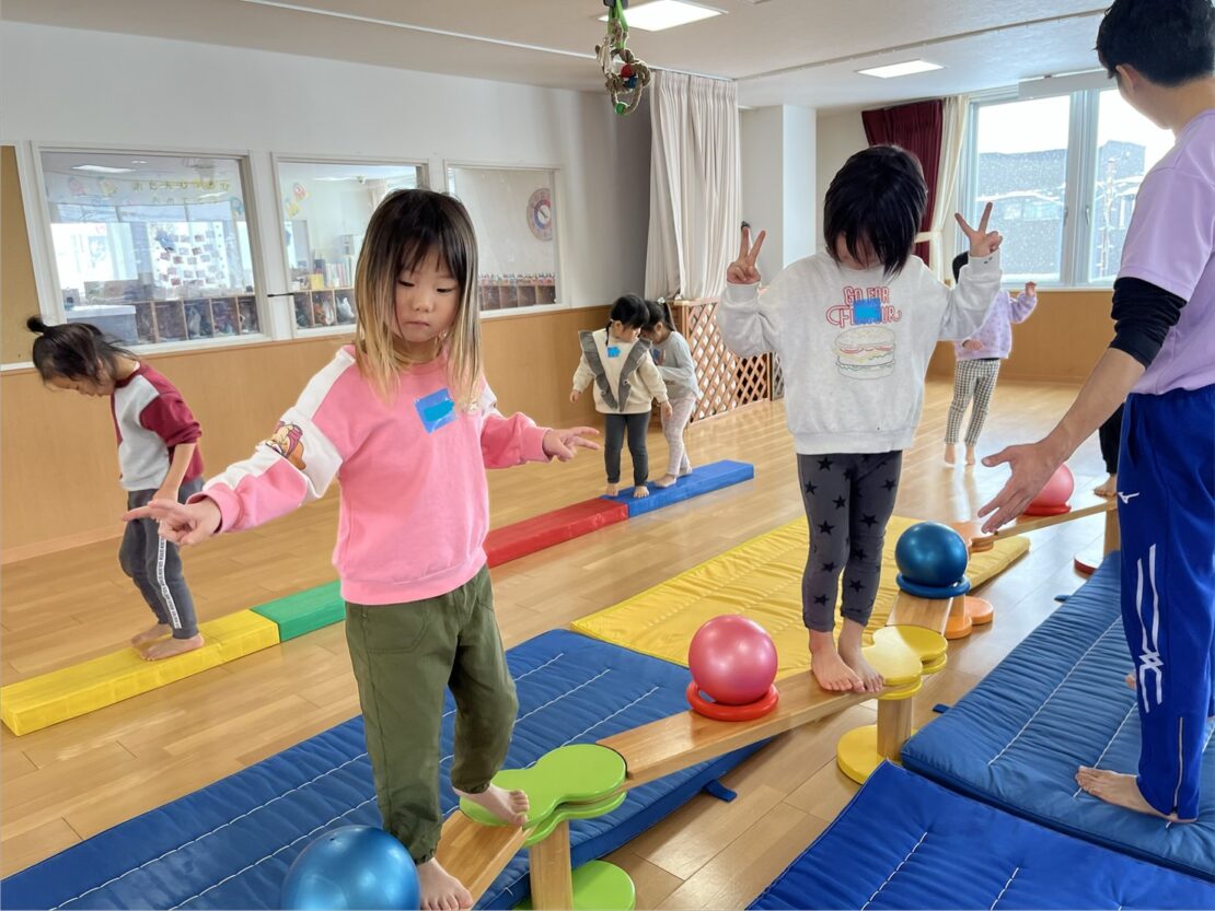 平均台は、バランス感覚や体幹(腹筋・背筋)を養い、姿勢の改善や転倒しにくい体づくりに不可欠な遊具です。