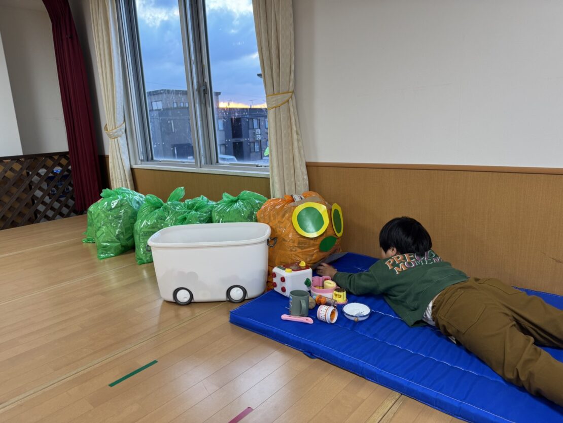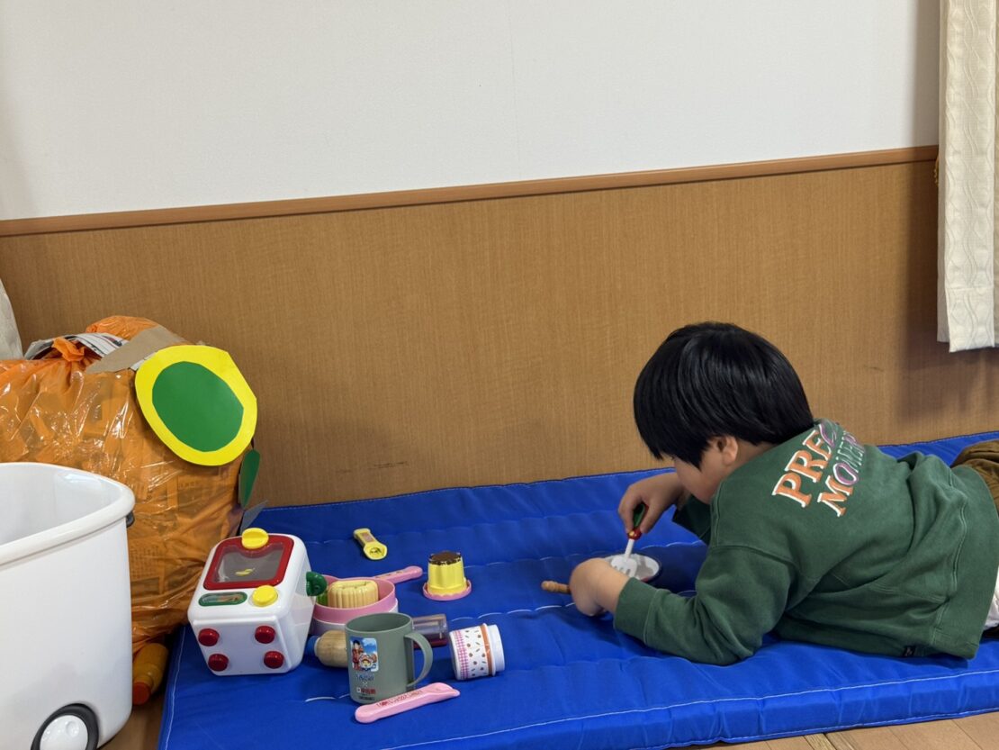 先日トトロおじさんと一緒に作った『はらぺこあおむし』にご飯を作って食べさせてあげていました。