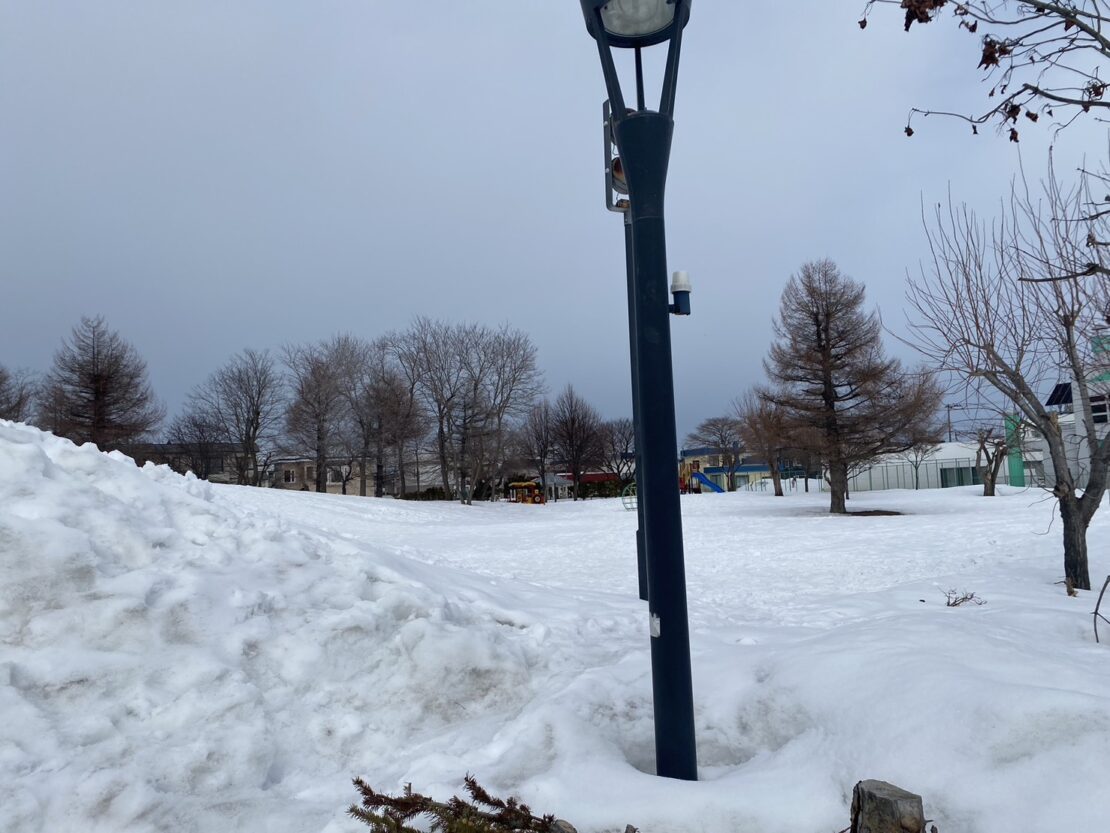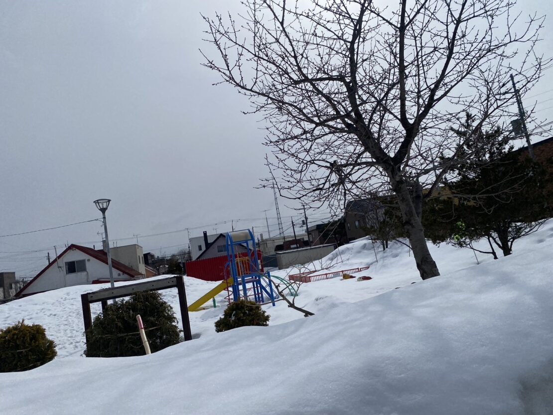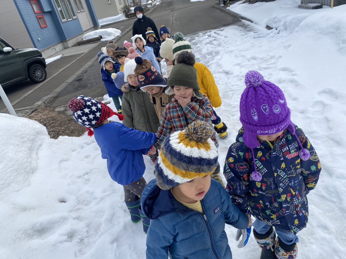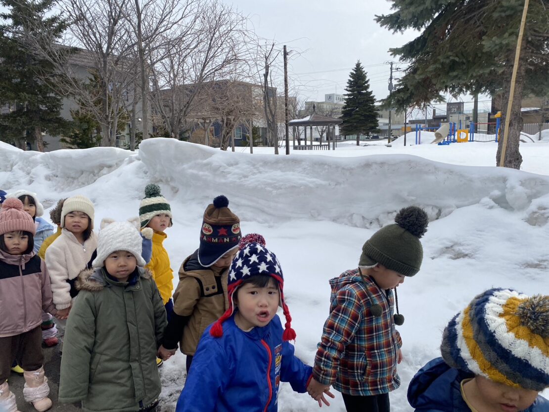 どこもまだ雪が積もっていましたが「この公園でどんぐり集めたよねー」、「さくらさんがさくらんぼ取ってくれた公園だ!」と、雪が降る前の思い出を振り返り楽しんで歩いていました!