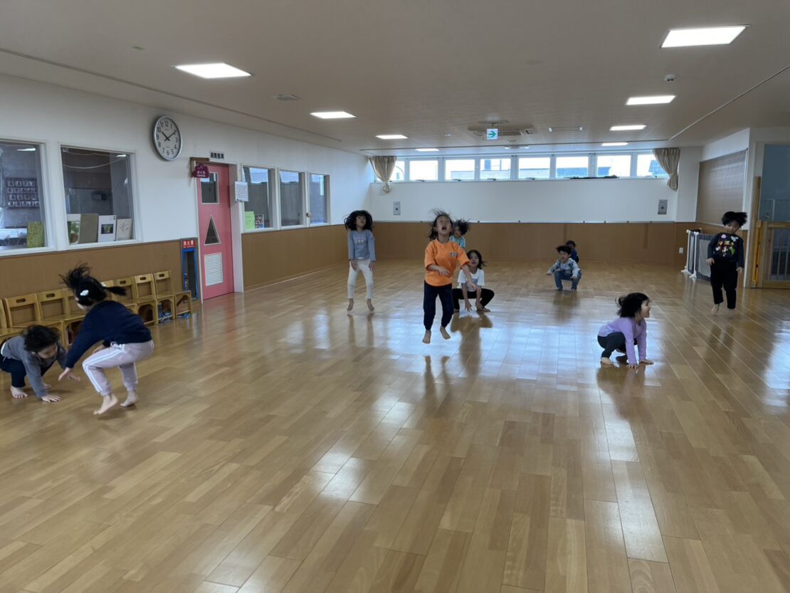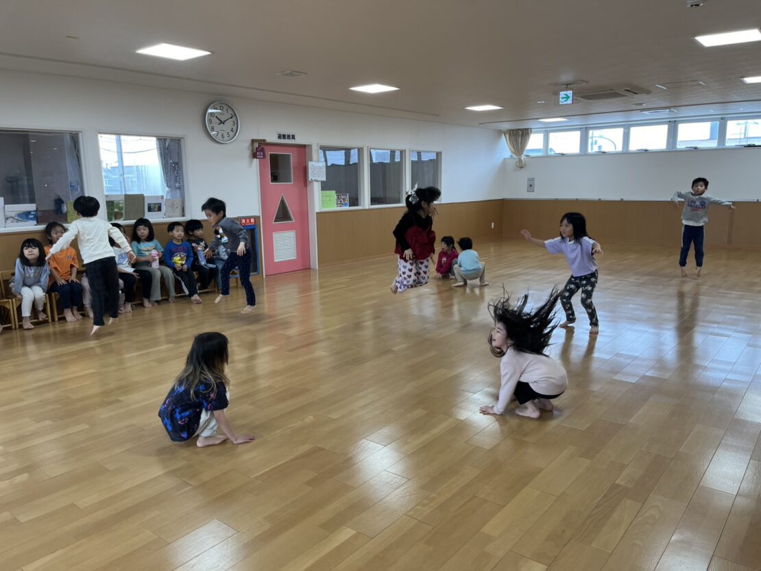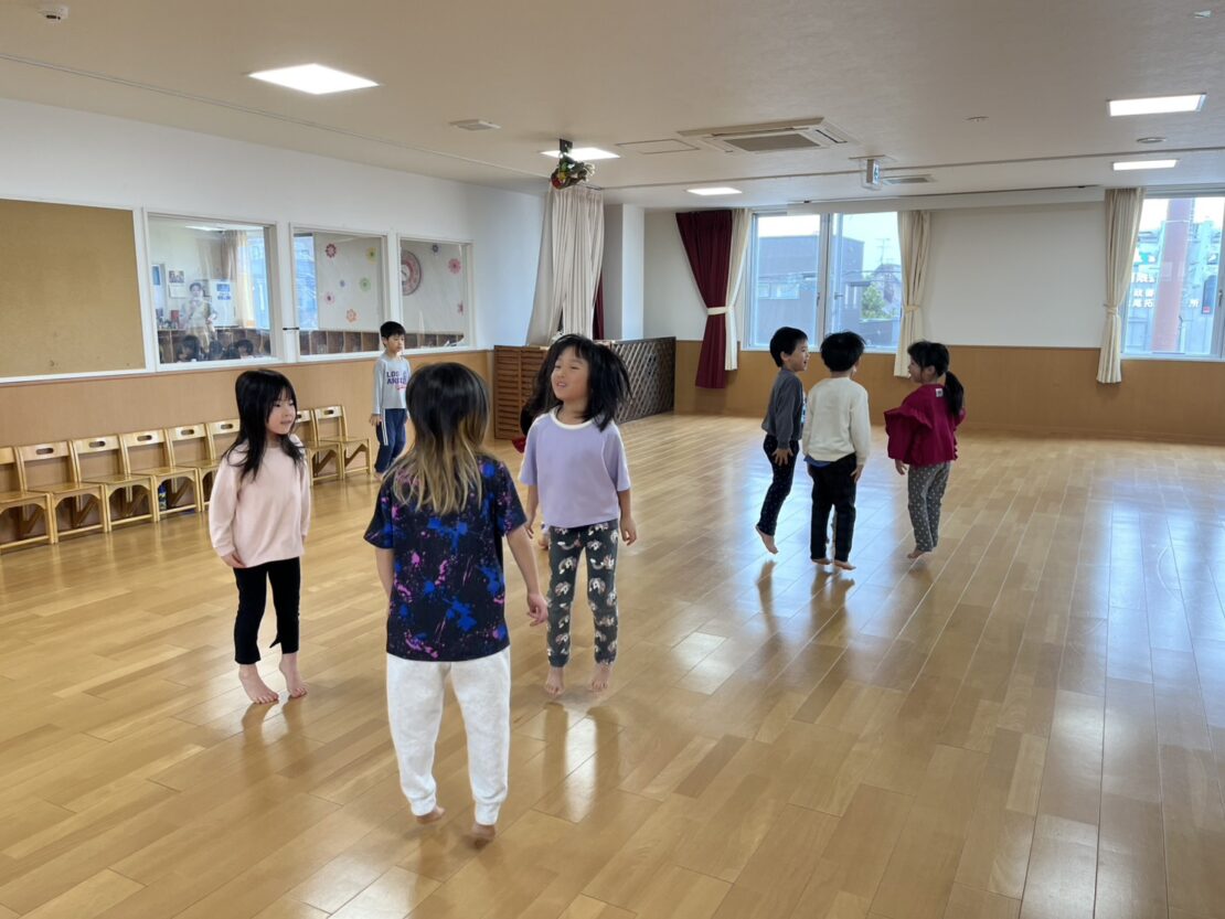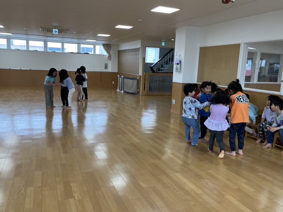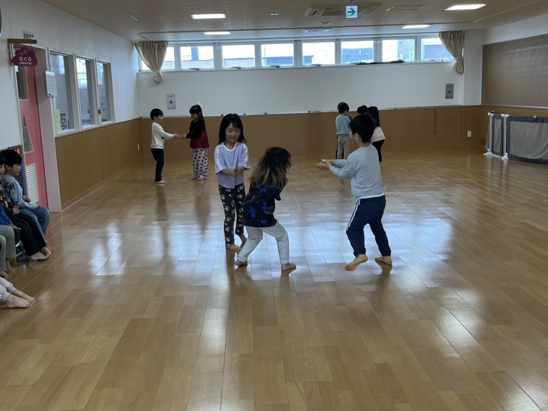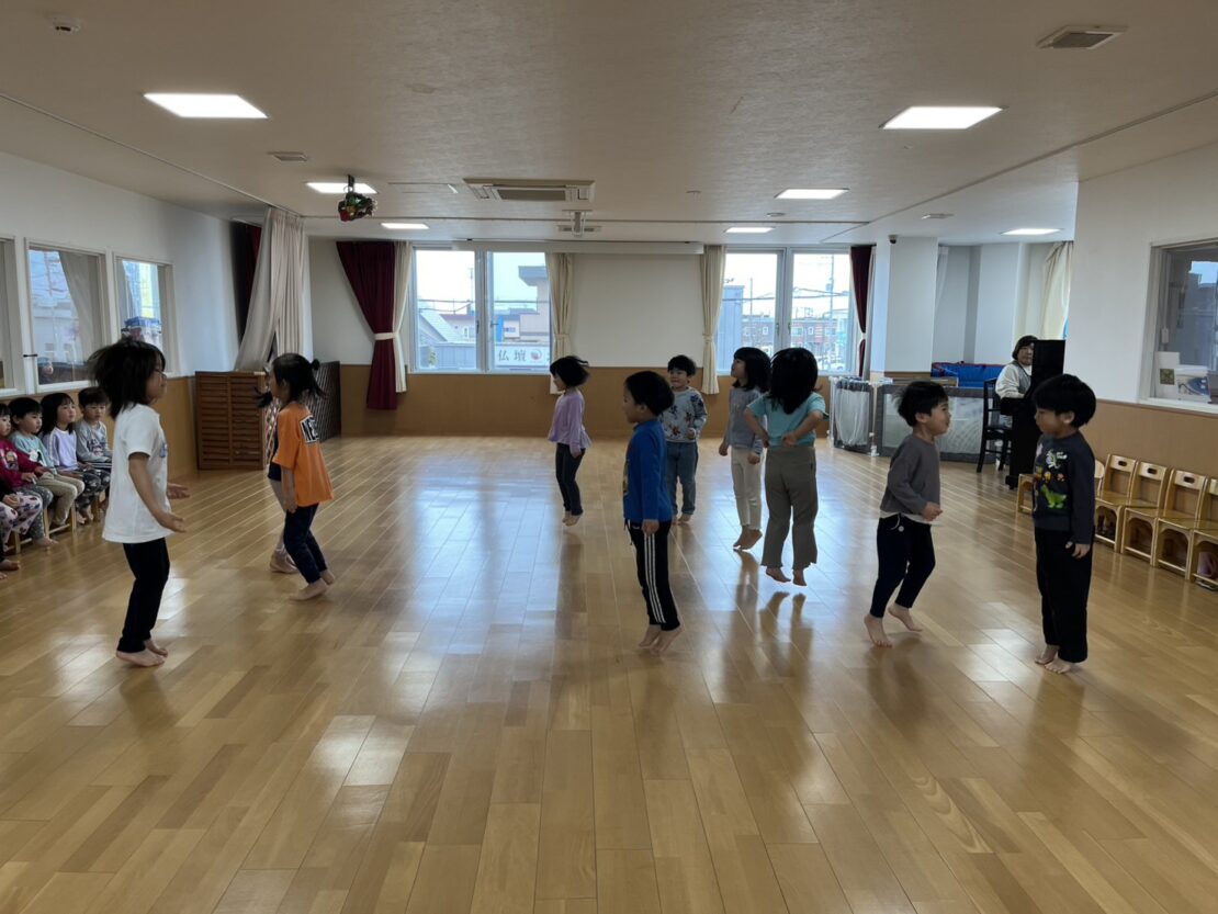 さくら(年長)組は、さくら組になって初めてのリズム遊びをしました。今後ほかのクラスとのリズム遊びに向けて、正しいお手本になれるように、一つ一つのリズムのポイントを確認しながら行いました。素敵なお手本になれるように昨年以上に張り切って参加していましたよ。