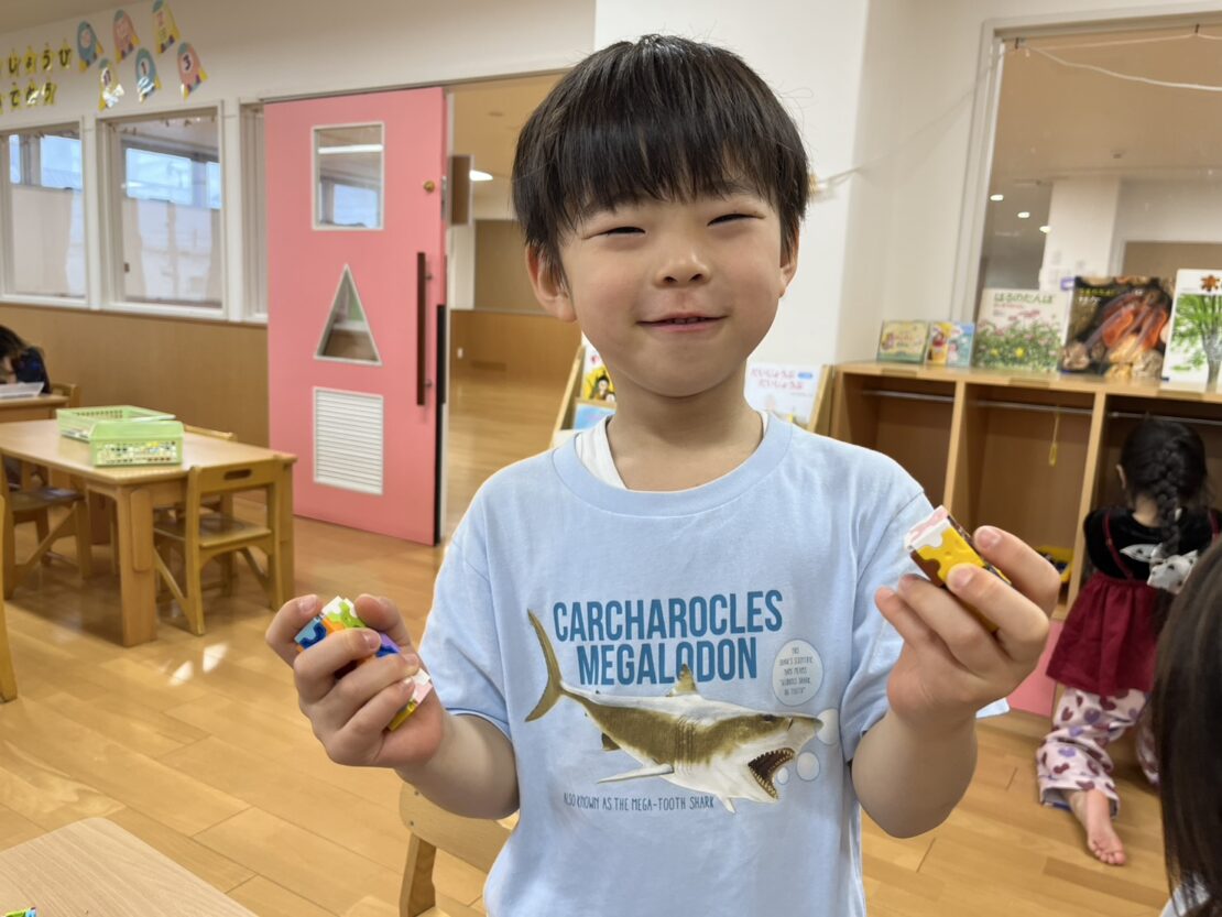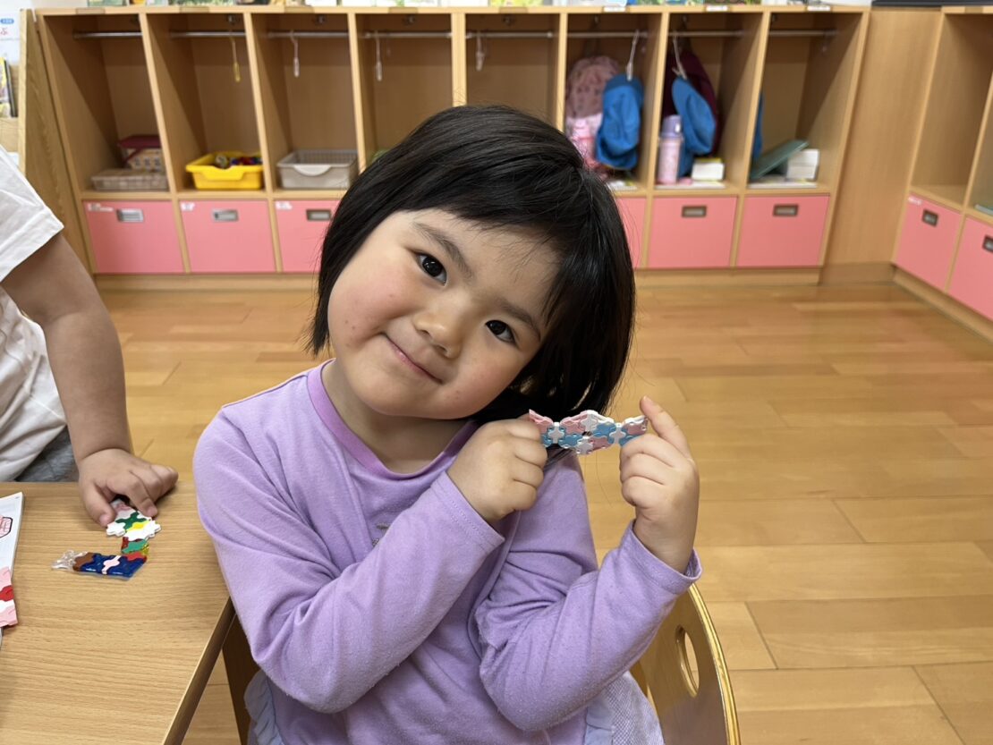 夕方のコーナー遊びの時間。新しいお部屋の新しいおもちゃで、少しずつ作品を完成させる子どもたちです。