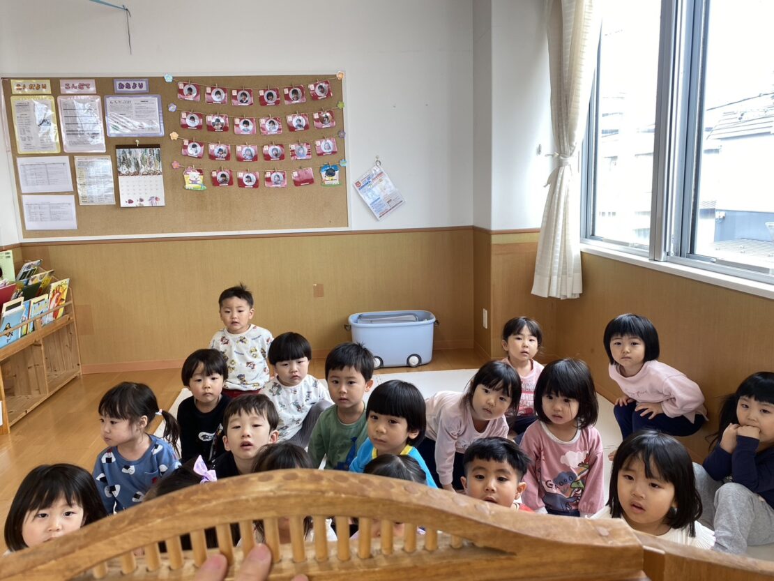 いつもと違って紙芝居舞台に紙芝居を入れて読むと興味津々の子どもたちでした!