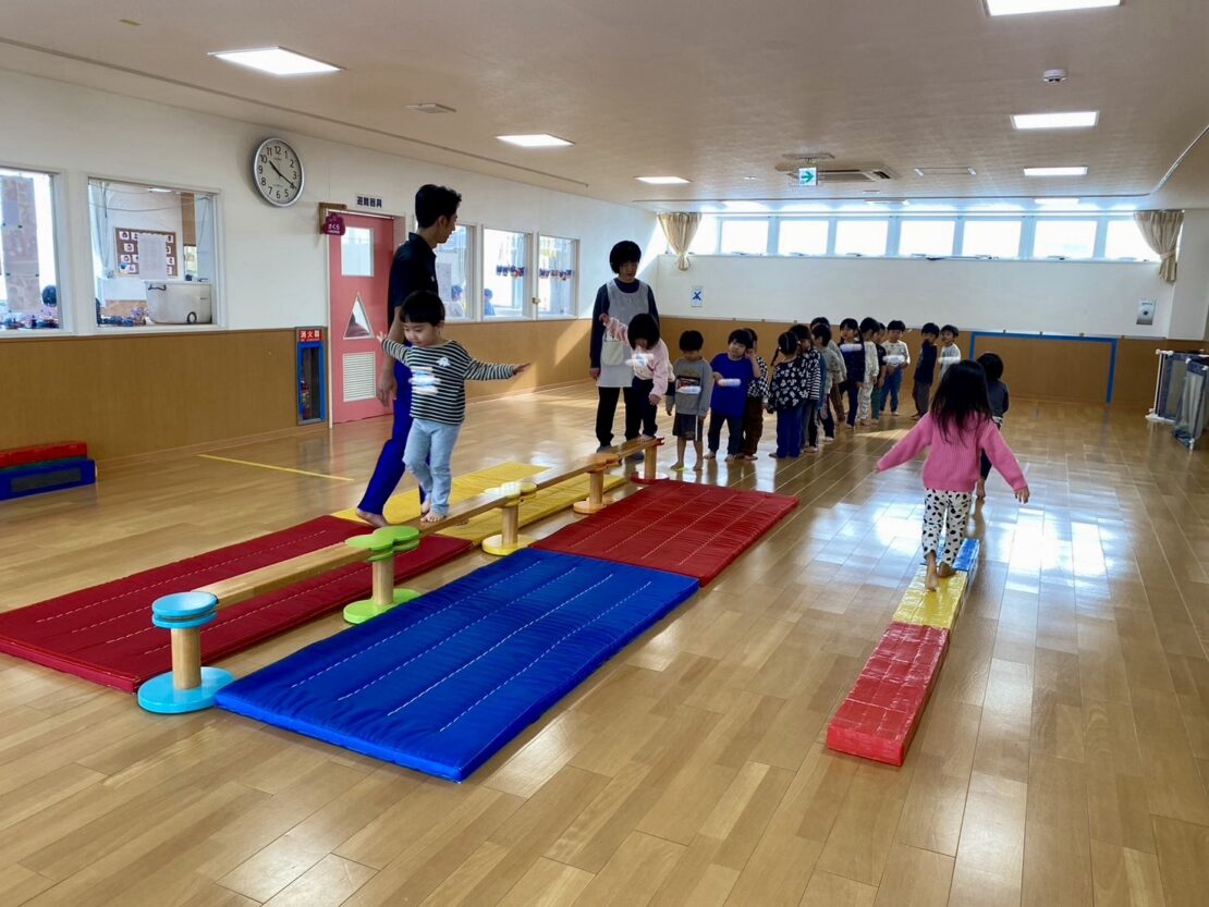 後半は平均台の上に障害物が置かれ、それをまたいで渡ると言う難関にも、みんなバランスを取りながら頑張って渡っていましたよ!