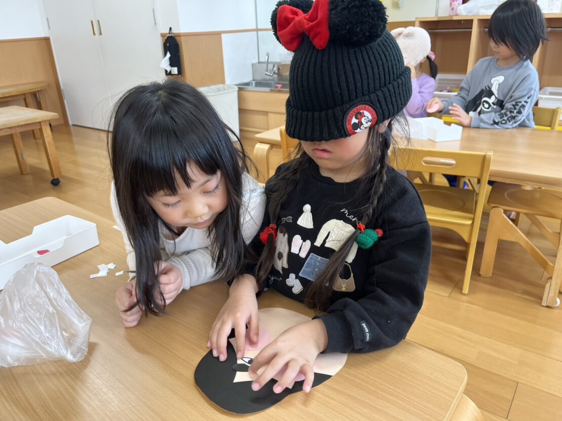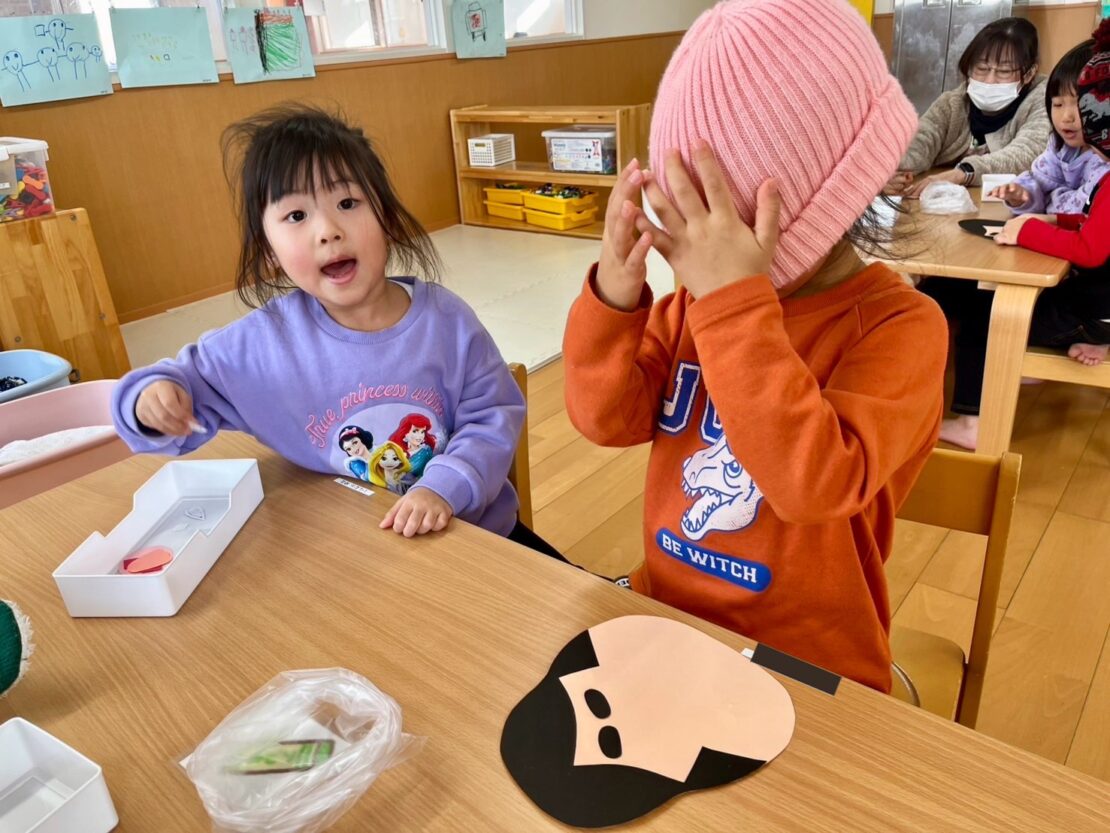 目を隠して行うのが難しい様子でしたが、完成したおかめの顔を見て大爆笑の子どもたちでした!