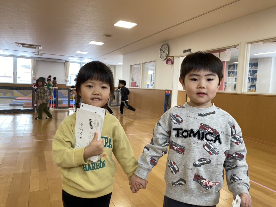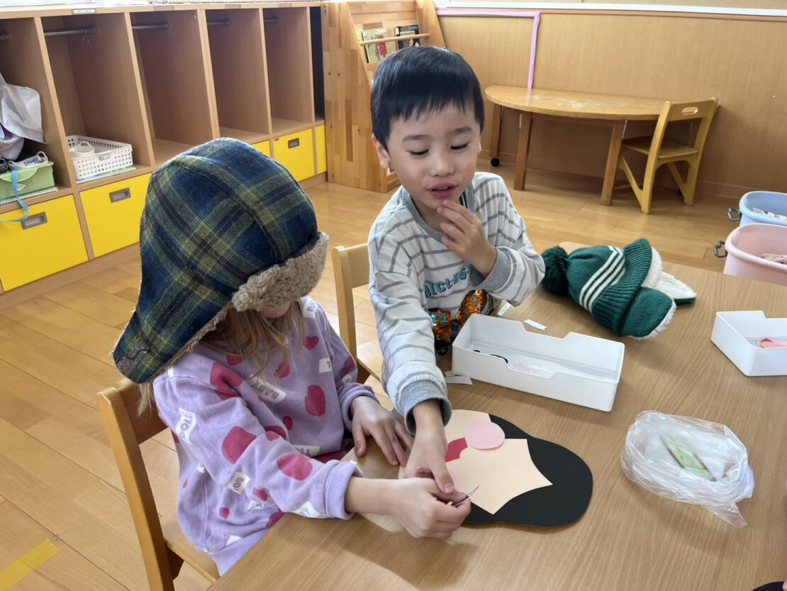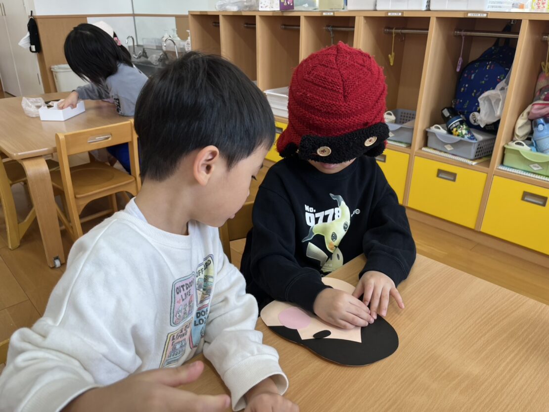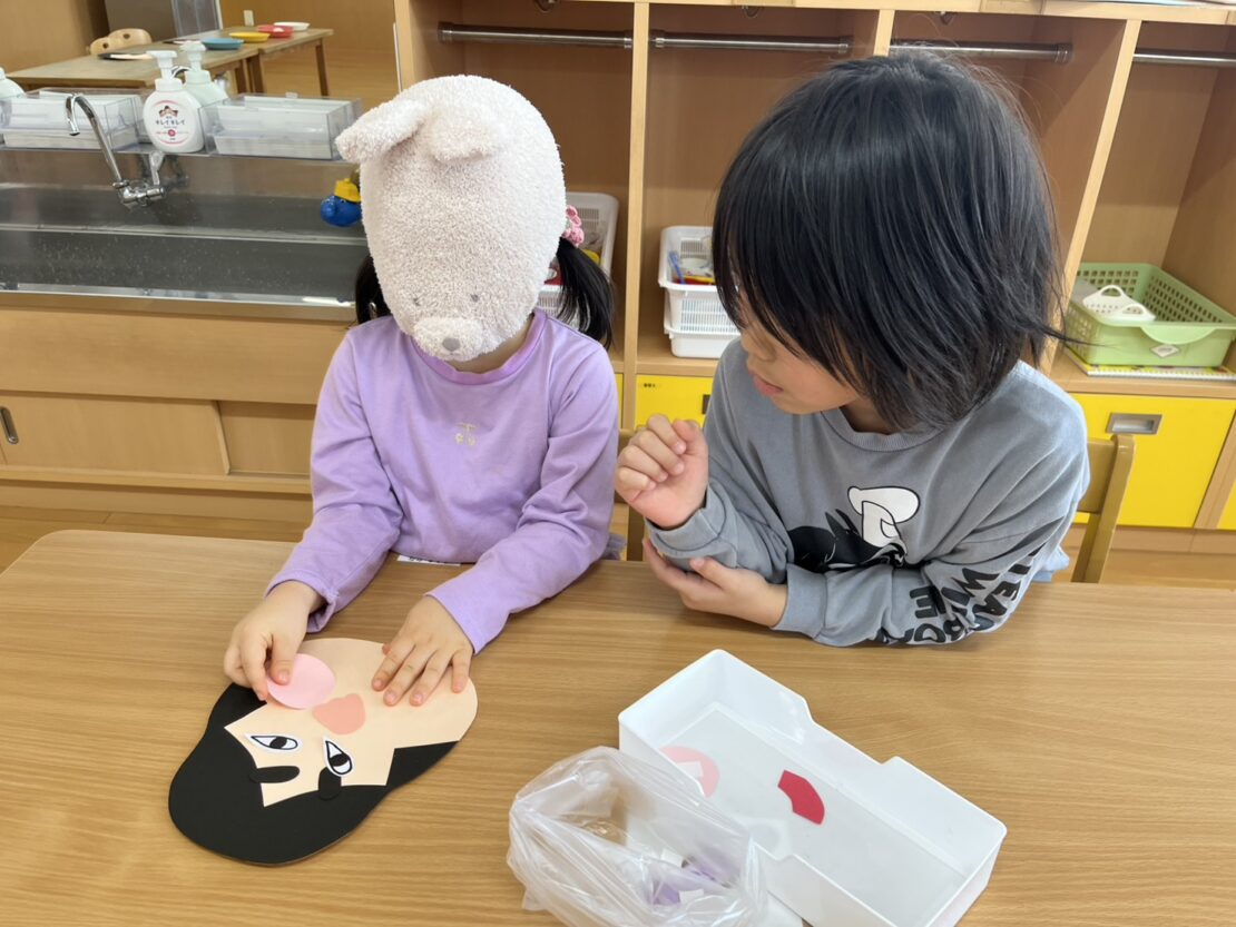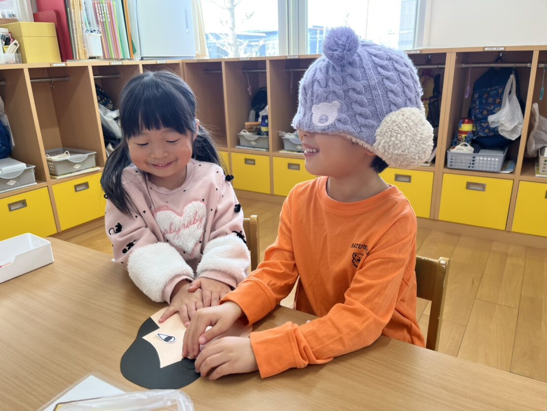 目を隠して行うのが難しい様子でしたが、完成したおかめの顔を見て大爆笑の子どもたちでした!